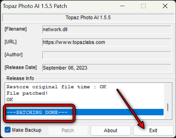 PATCHING DONE 메시지가 뜨면 Exit를 클릭해서 프로그램을 종료합니다.
