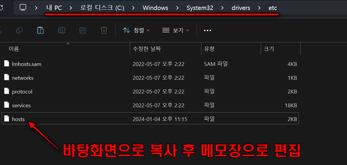 host 파일을 편집합니다. 파일은 C:\Windows\System32\drivers\etc 경로에 있습니다. 바탕화면으로 복사 후, 메모장으로 편집하는 걸 추천합니다.