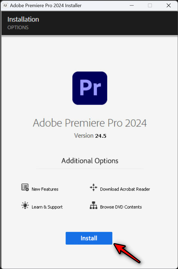 프리미어 프로 2024 설치 프로그램입니다. Install 을 클릭하고 이후 나오는 설치 옵션에서 계속 을 클릭하면 프리미어 프로 2024 버전 24.5의 설치를 시작합니다. 별도의 인증 과정은 없으며, 크랙 또한 자동으로 설치합니다.