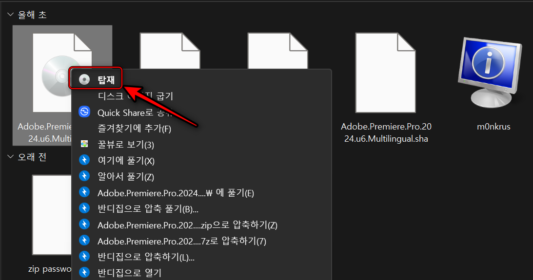 압축을 푼 폴더 내에 있는 Adobe.Premiere.Pro.2024.u6.Multilingual 파일을 오른쪽 마우스 클릭하고 탑재 를 클릭합니다.