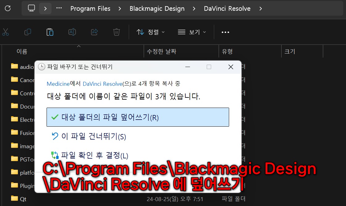복사한 파일을 C:\Program Files\Blackmagic Design\DaVinci Resolve 에 덮어쓰기를 합니다.