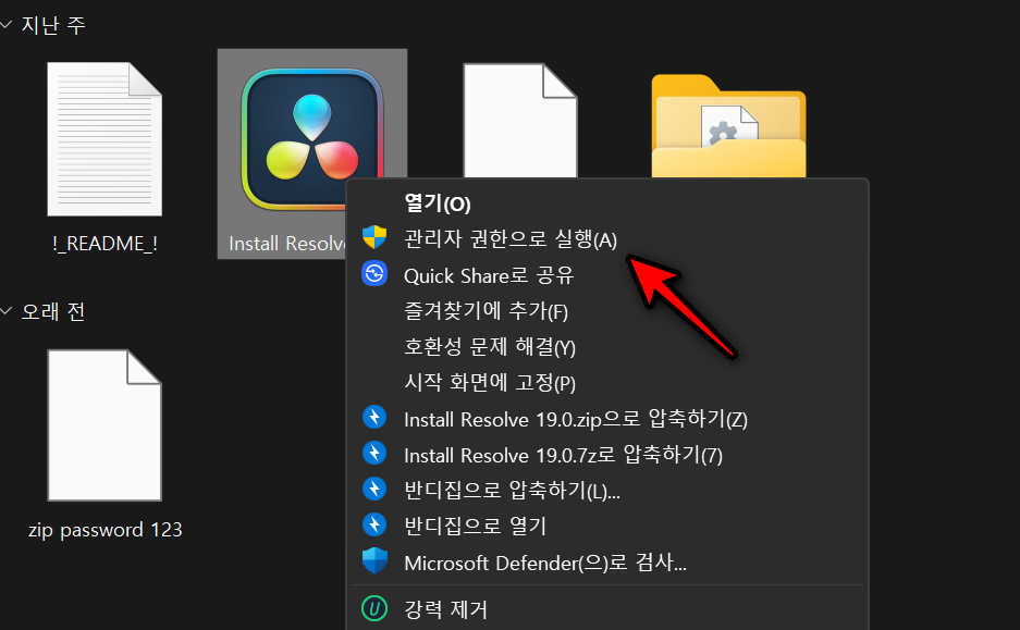 압축을 푼 폴더 내에 있는 Install Resolve 19.0 파일을 관리자 권한으로 실행합니다.