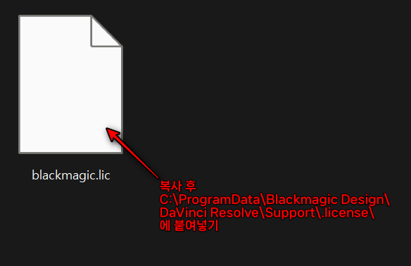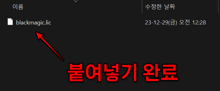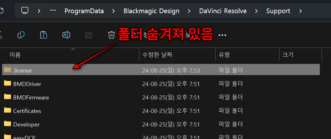 복사한 파일을 \DaVinci Resolve\Support\.license\ 에 붙여넣기 합니다. .license 폴더는 숨겨져 있기 때문에, 숨김 파일 표시 체크를 해야 합니다.