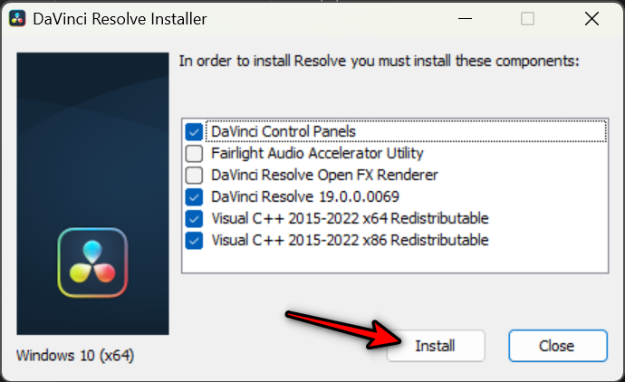 다빈치 리졸브 19 설치 프로그램입니다. 설치할 파일을 선택하고 Install 을 클릭합니다.