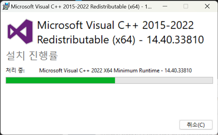 이어지는 Visual C++ 설치도 같이 진행합니다. 자동으로 설치하기 때문에 별다른 클릭은 필요 없습니다.