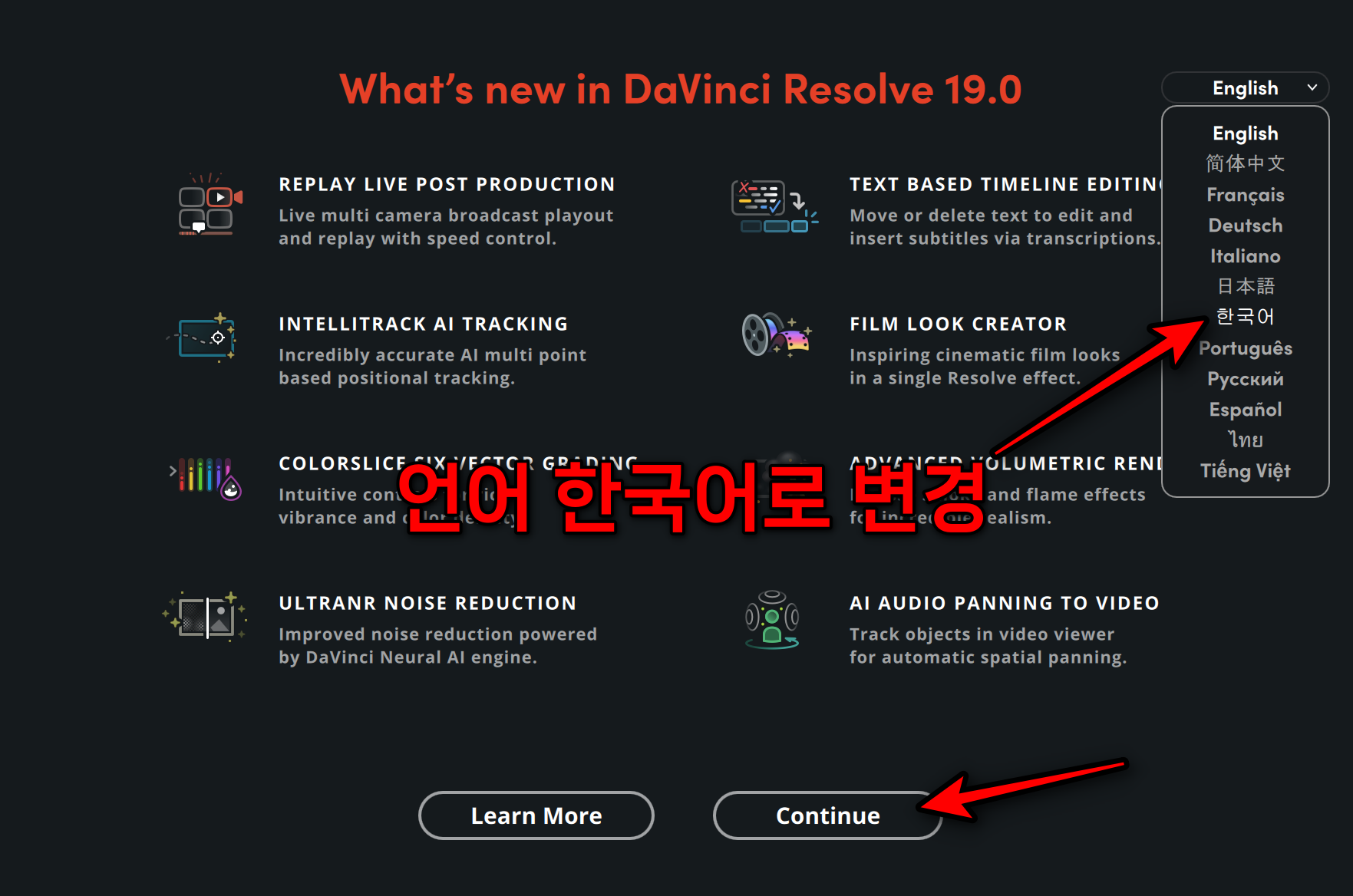 언어를 English에서 한국어로 변경하고 Continue를 클릭합니다.