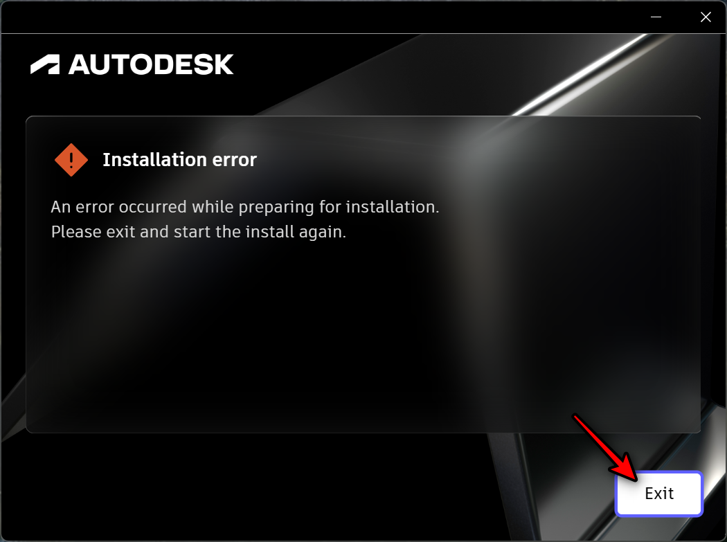재시작 하면 에러 메시지가 뜹니다. Exit를 클릭하고 다시 설치 프로그램을 실행합니다.