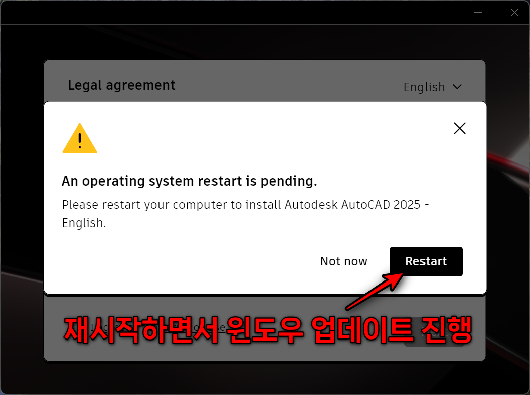 재시작 하라는 메시지가 뜹니다. 윈도우 업데이트가 필요한 경우이므로, 재시작을 하면서 원도우 업데이트를 진행하시면 됩니다.
