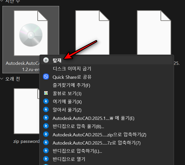 압축을 풀고 나오는 Autodesk.AutoCAD.2025.1.2.ru-en 파일을 우클릭하고 탑재를 클릭합니다.