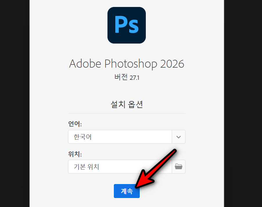 포토샵 2026을 설치 중입니다. 시간은 오래 걸리지 않습니다.
