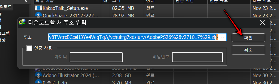 IDM에서 복사한 주소를 입력하고 확인 을 누릅니다.