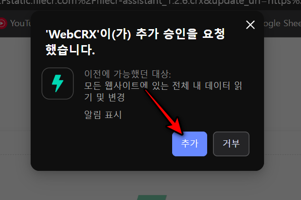 그러면 크롭 팝업창에 뜨는데, 추가 승인을 요청하는 내용입니다. 모든 웹사이트에 있는 전체 내 데이터 읽기 및 변경 이라는 내용이 꺼림칙합나다. 추가 를 클릭합니다.