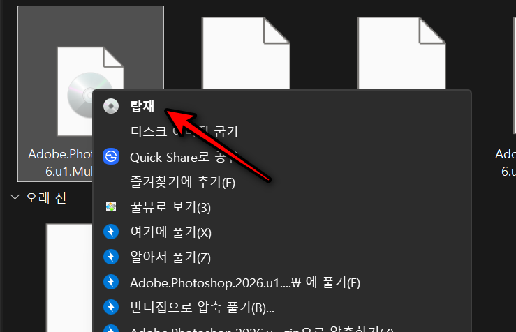 압축을 푼 폴더 안에 있는 이미지 파일을 우클릭하고 탑재 를 클릭합니다.