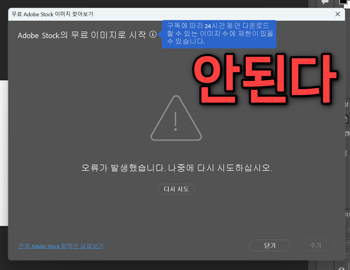 추가로 혹시 인터넷도 연결되어 있는 건가 해서 무료 스톡 이미지 추가를 클릭해 보았습니다.