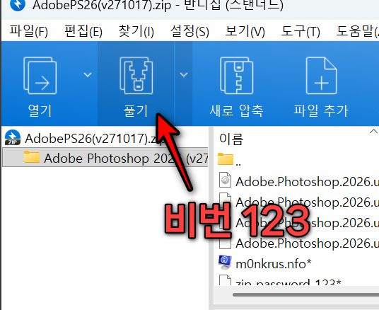 다운로드가 끝나면 압축 파일을 풀어줘야 합니다. 압축을 풀어줍니다. 비번은 123 입니다.