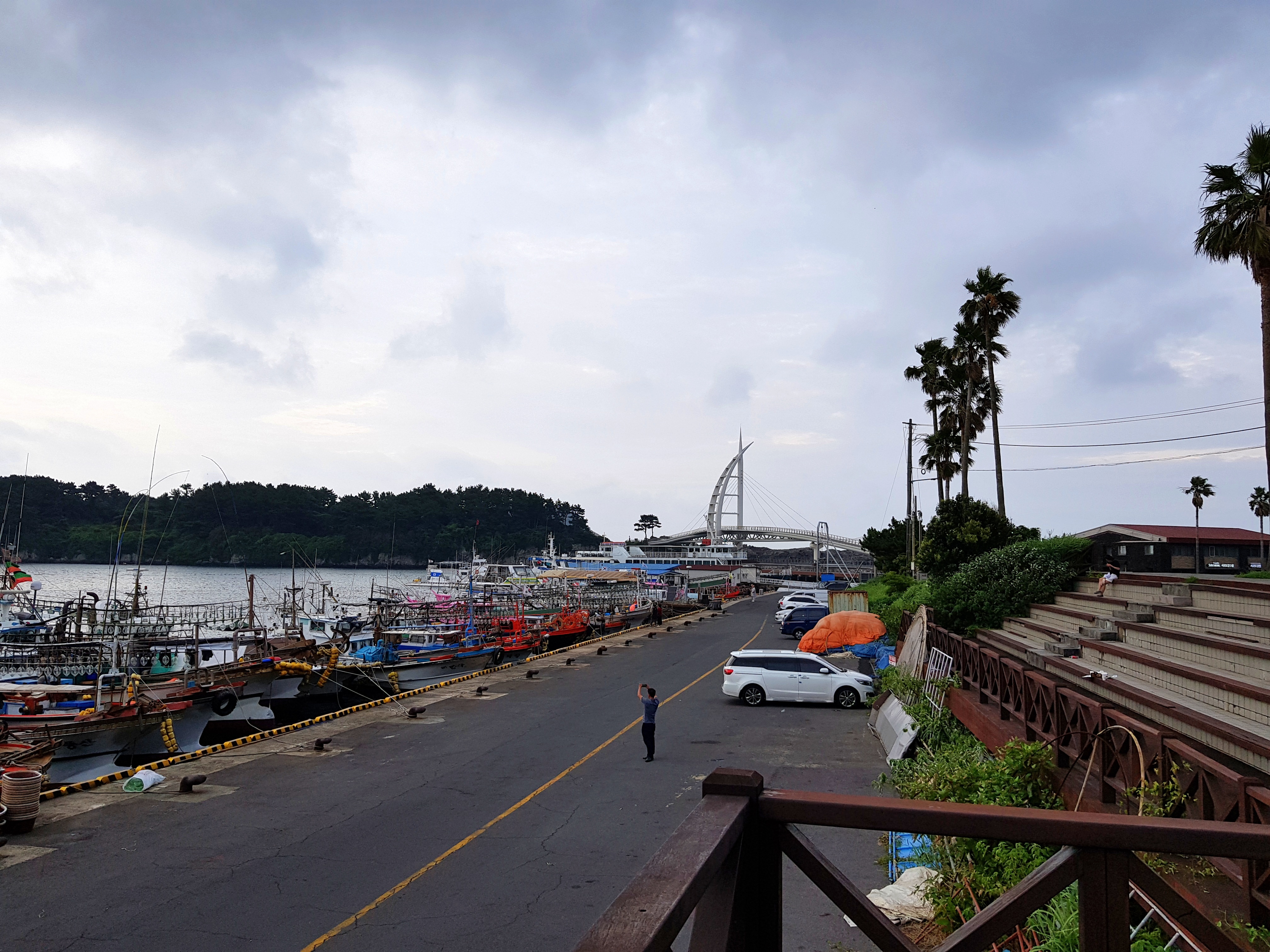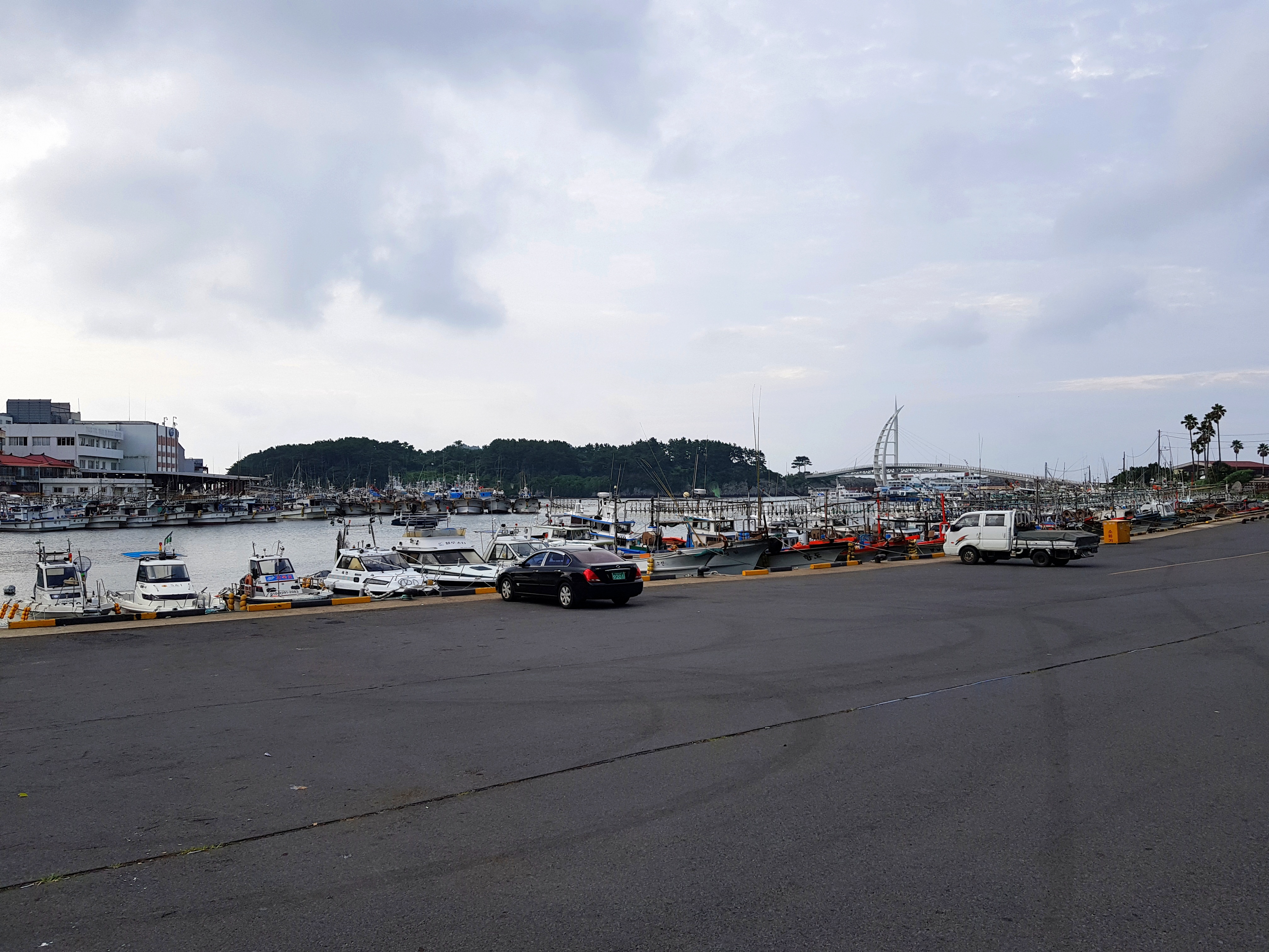 부두에 정박한 배들 너머로 새연교가 보였습니다.