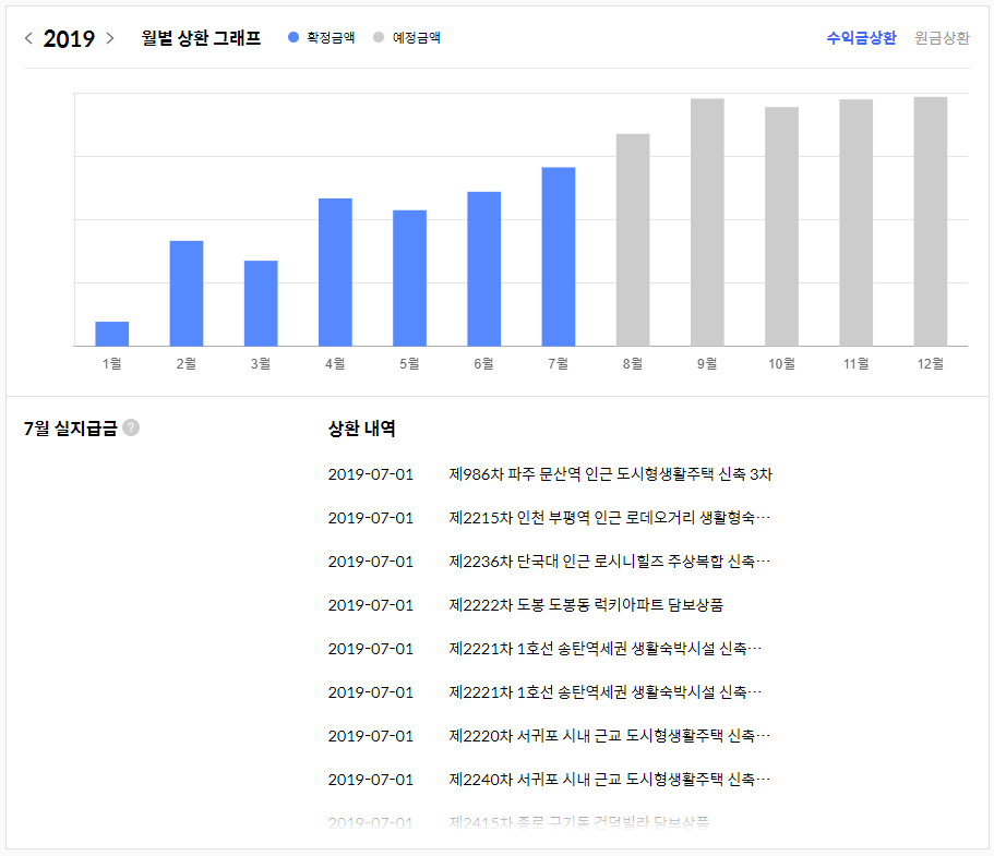 조기상환이나 연체가 있을 경우 변동이 있긴 하지만, 여태까지 저 그래프의 금액과 비슷하게 상환을 받아 왔습니다.