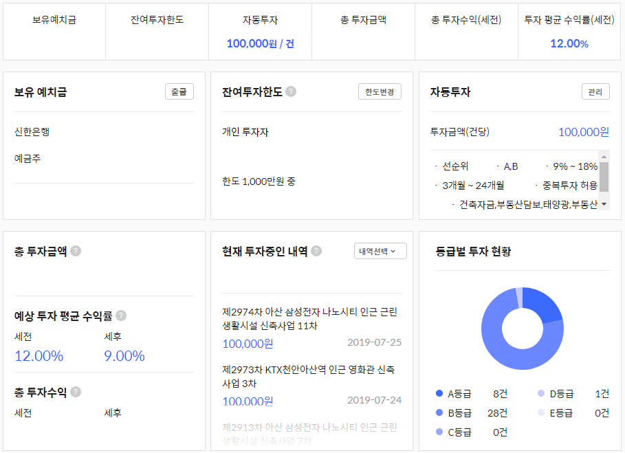 제 개인정보와 수익금에 관한 항목은 가렸습니다. 현재 세후 수익률은 9%이고 A등급8건, B등급 28건, D등급에 1건 투자하고 있습니다.