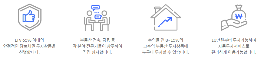LTV 65% 이내의 채권을 선별하고 수익률 8~15%의 고수익을 보장한다고 광고하고 있습니다. 최소 투자금액은 10만 원이고, 자동투자 서비스를 통해 간편하게 투자할 수 있습니다.