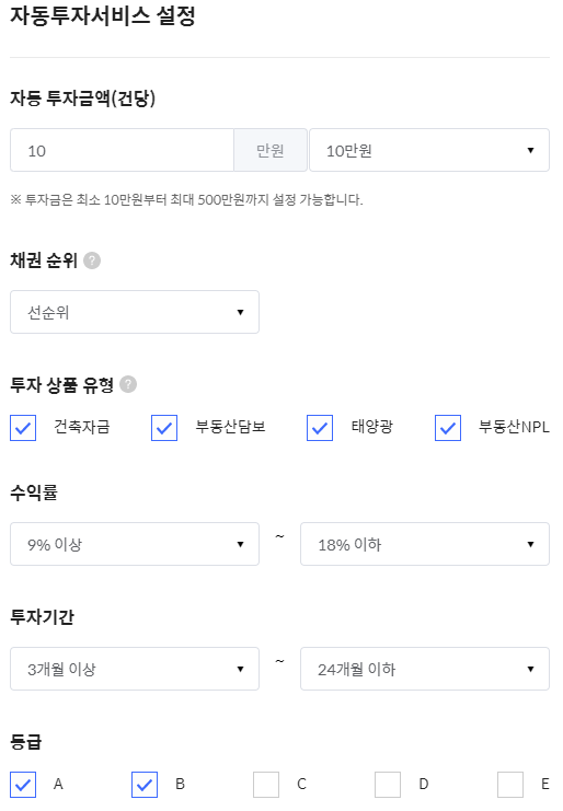 저는 채권 선순위, 모든 투자 상품, 9~18% 수익률 A, B등급으로 자동투자 설정을 했습니다. 아무래도 자동투자는 제가 직접 알아보지 못하고 투자하는 만큼 최대한 안전한 쪽으로 설정해 두었습니다.