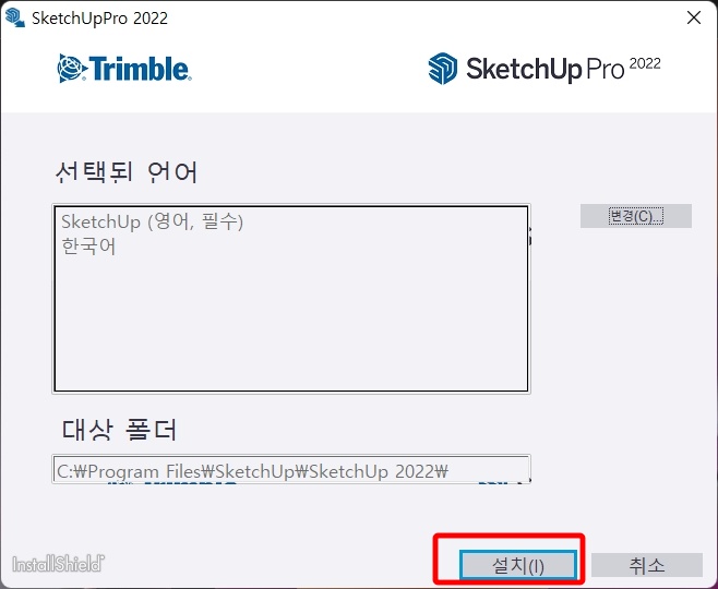 한국어 로 설정한 후 설치 를 클릭하면 스케치업 프로 2022 설치가 시작됩니다.