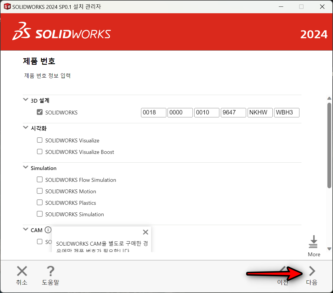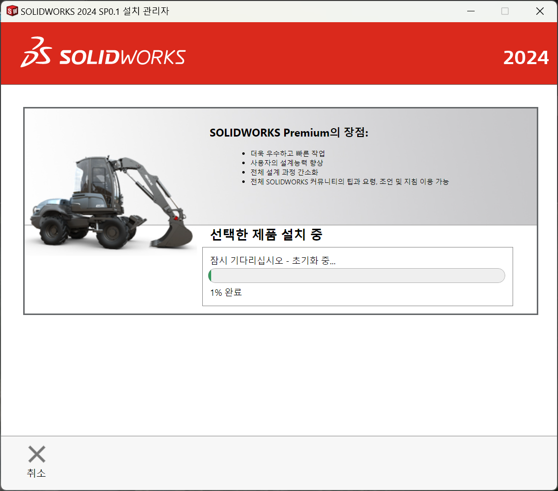 솔리드웍스 2024 설치를 진행합니다. 설치 시간은 5~10분입니다.