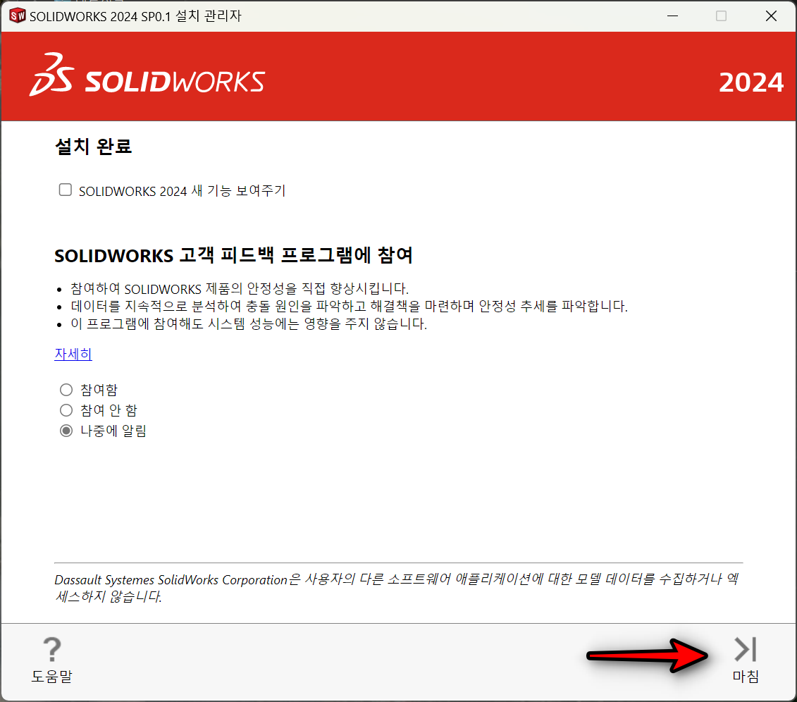 여기까지 하고 컴퓨터를 재부팅합니다. 이후 솔리드웍스 2024를 실행합니다.