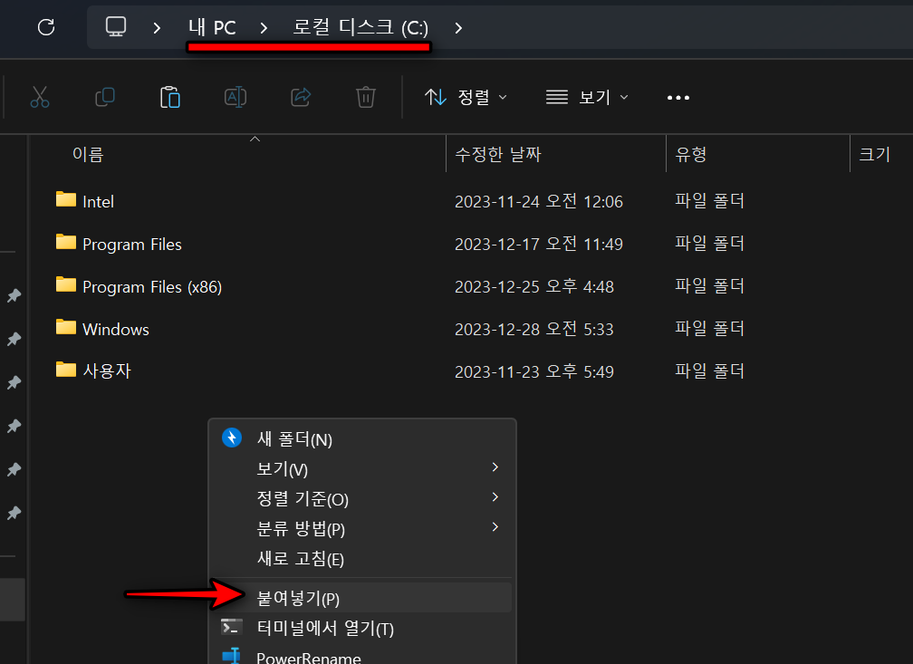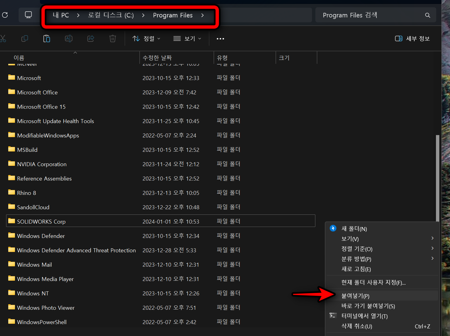 C:\Program Files 에 그대로 붙여넣기 합니다. 만약 제대로 붙여넣기가 안되면 작업관리자를 실행하고 솔리드웍스 관련 프로그램들을 전부 종료합니다.