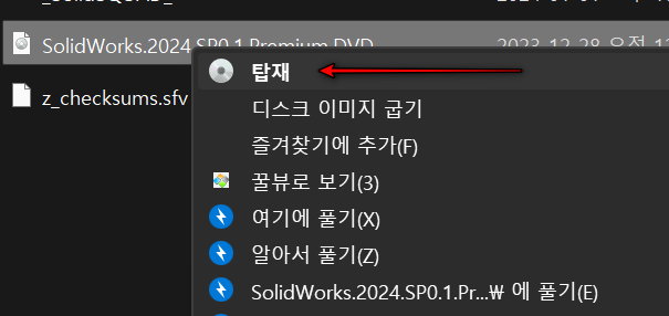 SolidWorks.2024.SP0.1.Premium.DVD 파일을 탑재 합니다. 만약 탑재가 제대로 되지 않으면, 압축을 해제합니다.