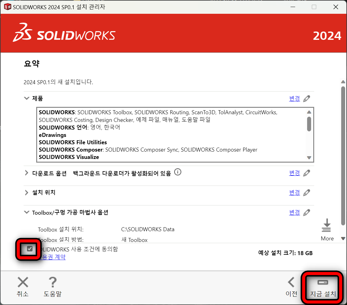 사용 조건에 동의함에 체크하고 지금 설치 를 클릭하면 솔리드웍스 2024 설치를 시작합니다.