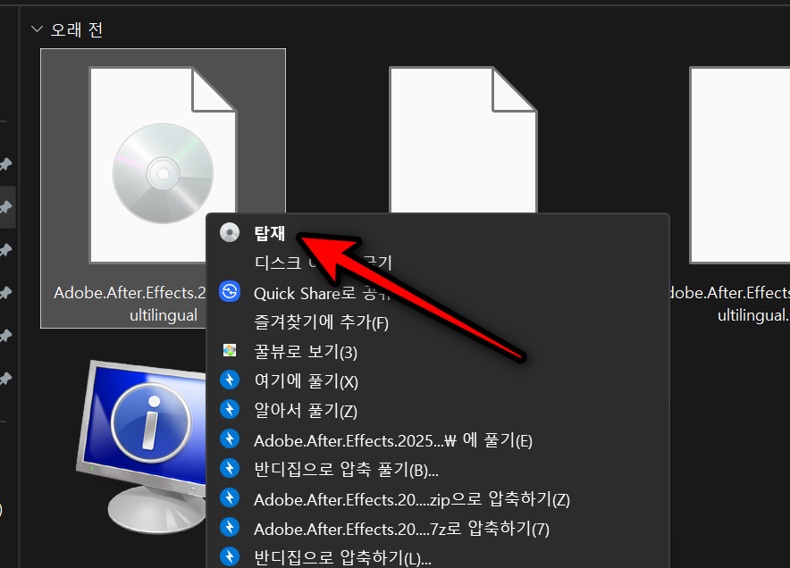 Adobe.After.Effects.2025.u2.Multilingual 파일을 우클릭하고 탑재 를 클릭합니다.
